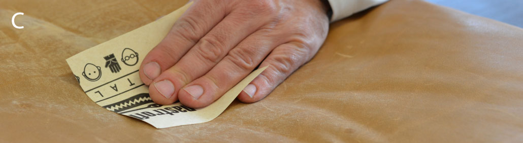 B. Dopo la pulizia e l’eventuale uso di Sgrassante per Pelle e Tessuto, applicare il Pulitore al Solvente per Pelli per rimuovere parte della vecchia rifinizione. Applicare con un panno o della carta assorbente, cambiandoli frequentemente per ottenere un’azione migliore. L’effetto che si ottiene con Pulitore al Solvente per Pelli è davvero notevole.