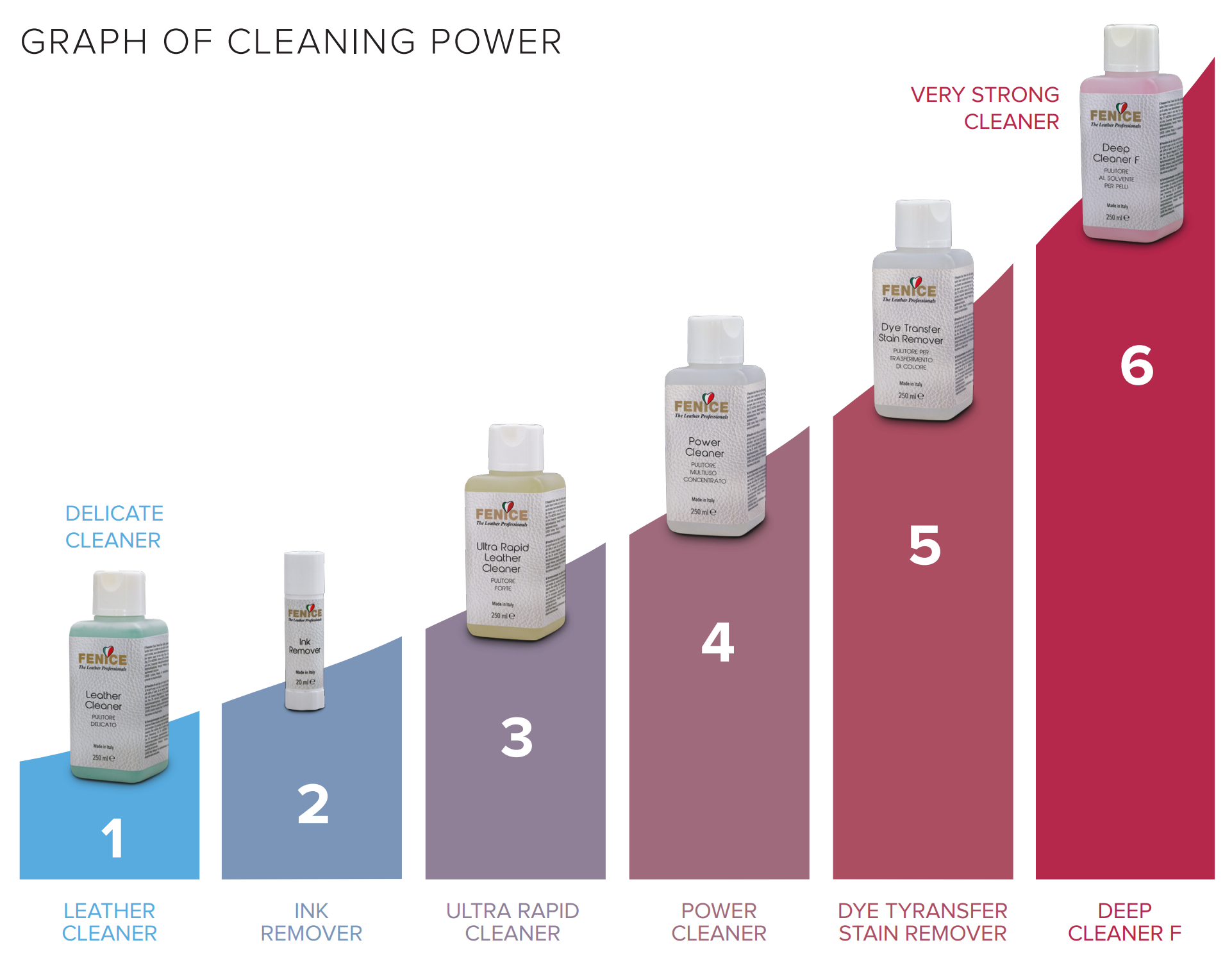 Deep Cleaner F is a strong cleaner specific for pigmented leather. It performs a powerful cleaning action by removing all types of stains: oily/greasy stains and transfers from jeans and newspapers in particular. This product must be used in a well-ventilated area.