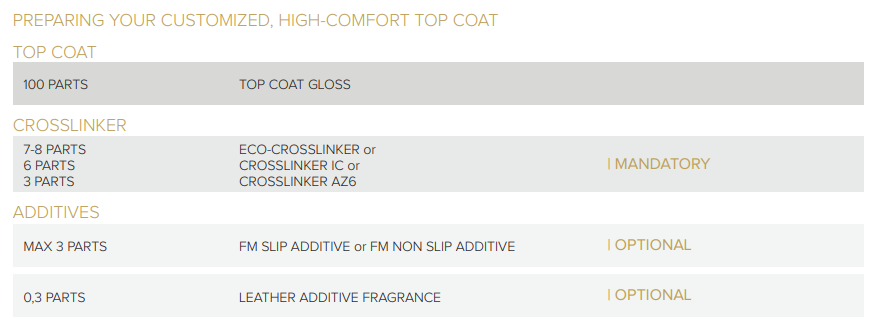 Eco-Crosslinker, Crosslinker IC or Crosslinker AZ6 should be added to Top Coat Gloss to improve general rub resistance, and wet rub in particular. Top Coat mixed with crosslinkers must be used within 8 hours.