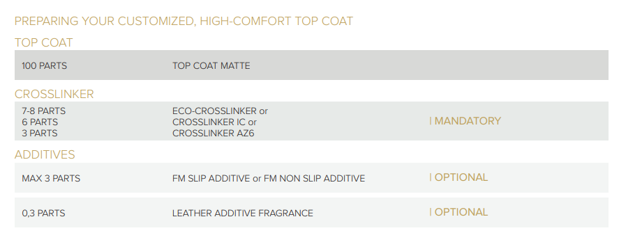 Top Coat Matte is a water-based, low-gloss fixing product for pigmented leather, characterized by excellent adhesion and outflow. It provides a uniform degree of opacity and high general fastness.