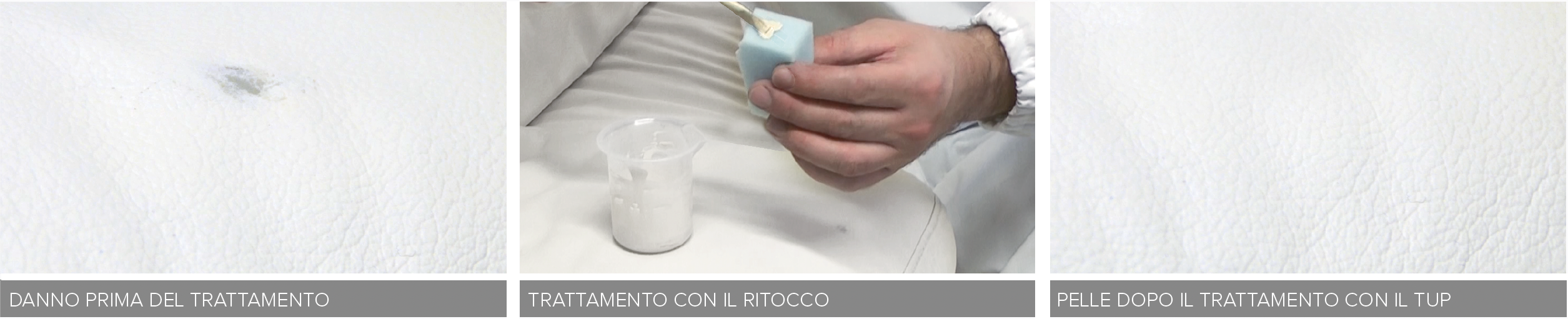 B. Per pelli con effetto bicolore può essere necessario tamponare in modo casuale la parte riparata con ulteriori piccole dosi di prodotto per simulare l’effetto bicolore. Per bicolori forti invece, sarà necessario scurire leggermente il colore prima di procedere ad una tamponatura casuale sull’area riparata.